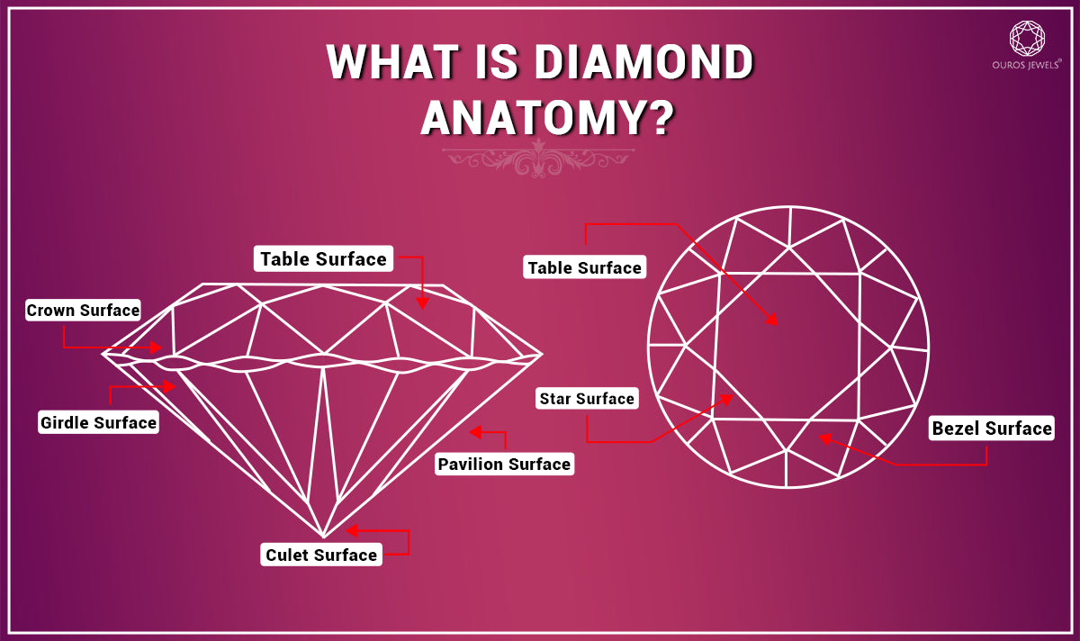Ans. Diamond anatomy refers to the structural components of a diamond, which include the table, crown, girdle, pavilion, and culet. These features guide how well a diamond reflects light, which affects its brilliance and overall look.
