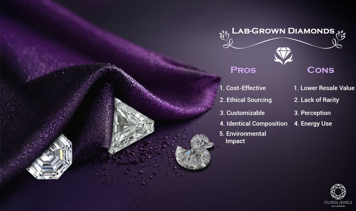 However, there are some downsides. Some people might see them as less valuable because they are man-made. Making these diamonds can use a lot of energy, and there are limits to the sizes and colors available. Traditional diamond buyers might also prefer natural diamonds, and the resale value of LGD may be lower. Choosing between lab-grown and mined diamonds depends on your values, preferences, and budget. By weighing the pros and cons, you can pick the option that best fits your needs.