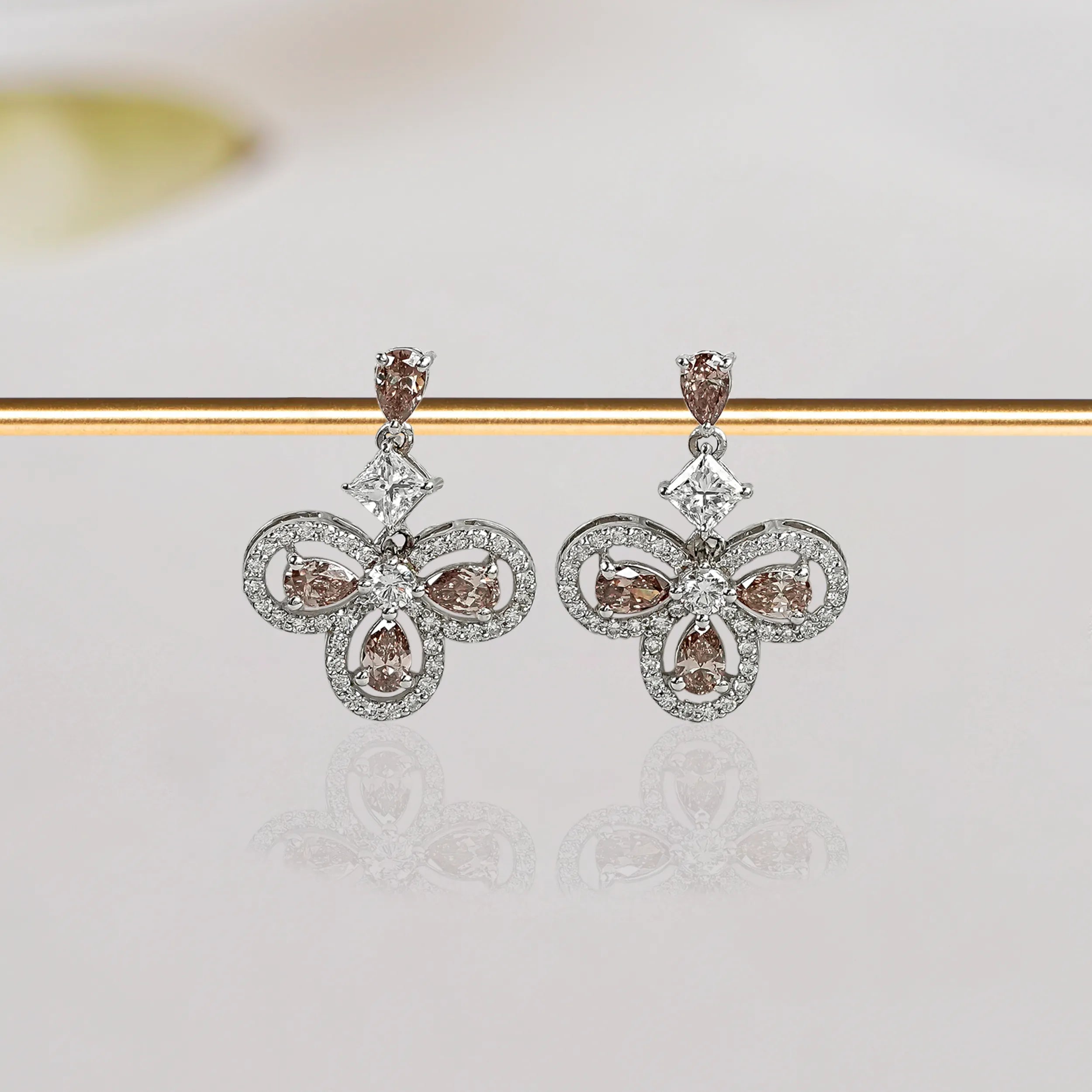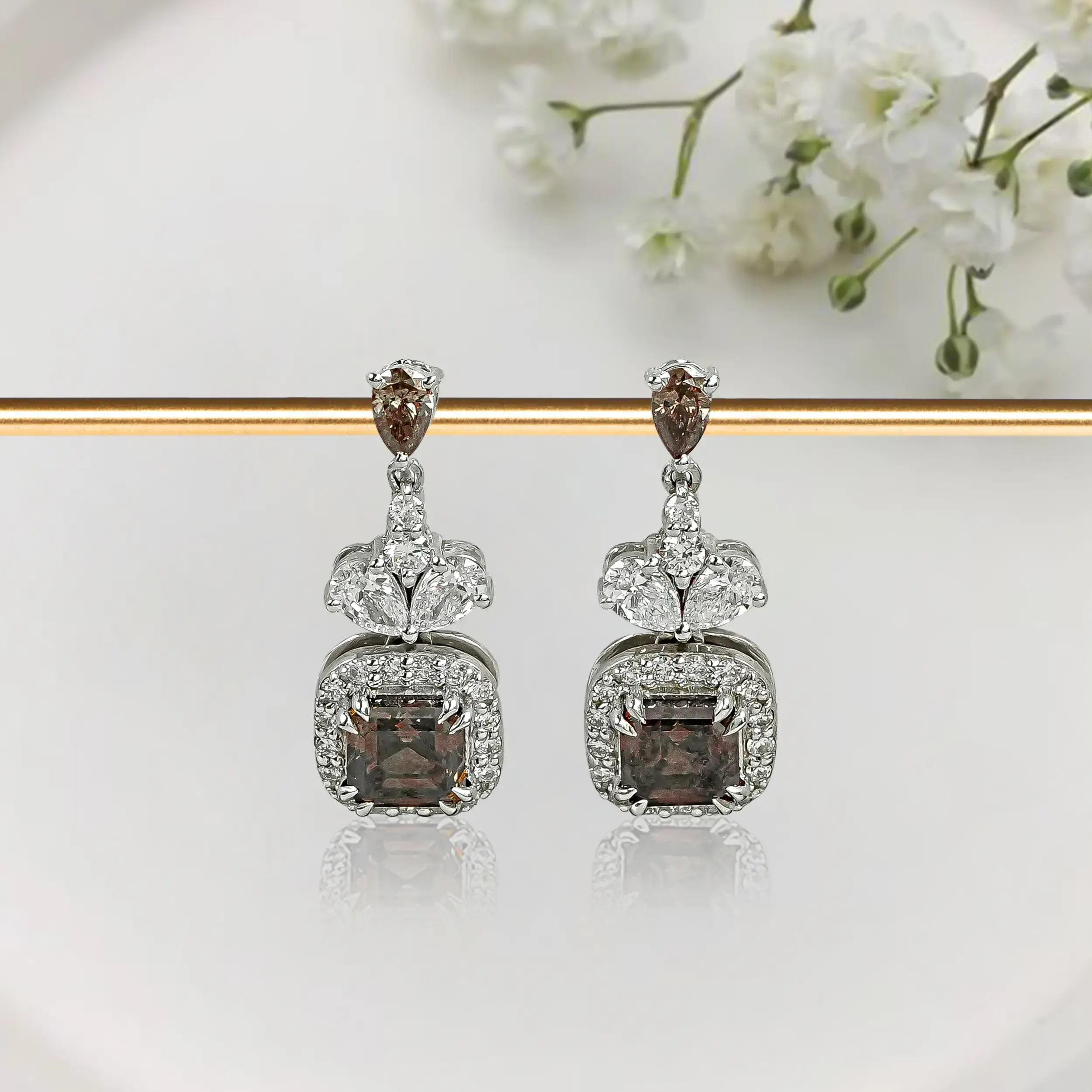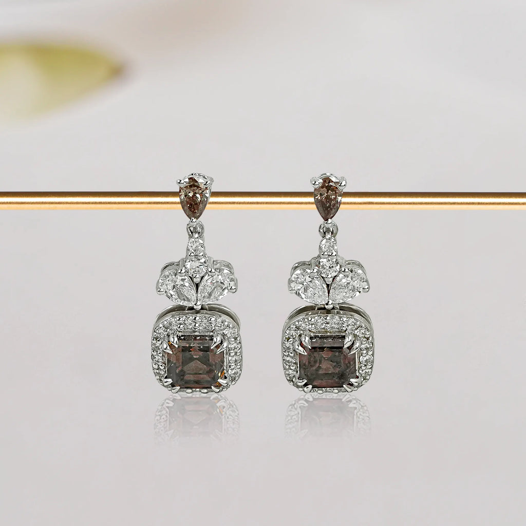 Browse our chocolate princess diamond dangle drop earrings, pear shaped chocolate charm diamond earrings, and round chocolate charm diamond dangle earrings. Craftmenship showcasing chocolate charm diamonds in different cuts.